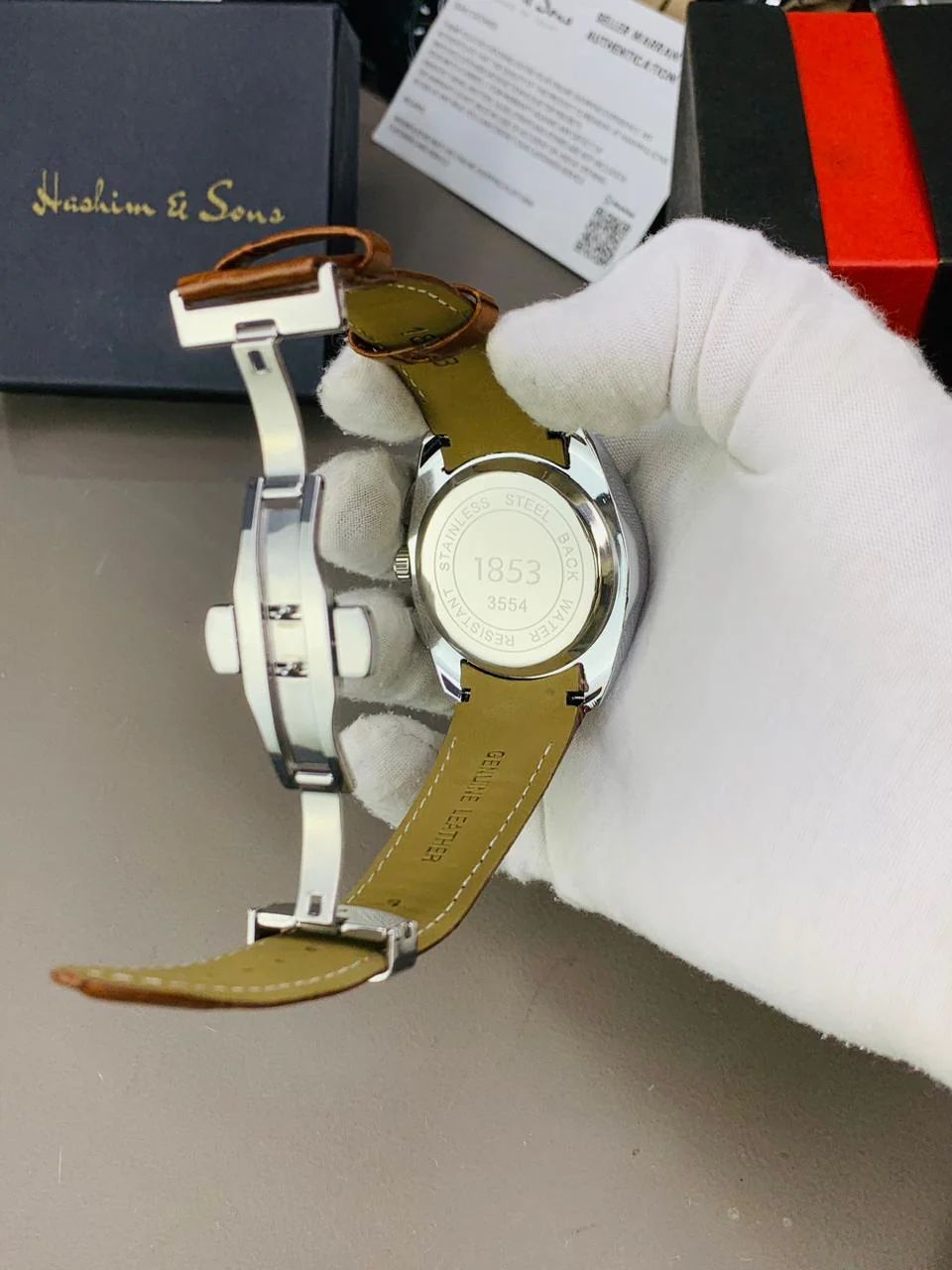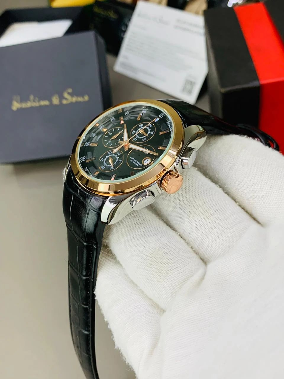 This watch features a genuine leather strap for comfort and elegance, a master lock for secure wear, and fully functional chronograph dials for accuracy and performance. Designed with premium quality materials, it offers durability and a timeless look.